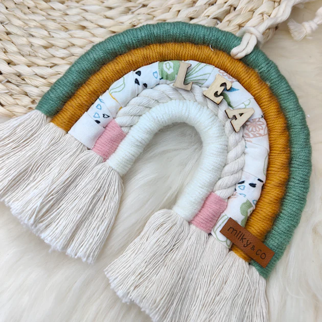 Cet arc-en-ciel à suspendre est une décoration idéale pour chambre d’enfant ou pour habiller les murs de sa chambre. Parfait également pour compléter un coffret naissance. Personnalisé avec le prénom ou mot de votre choix (maximum 9 caractères). Lettres en bois. Petit cordon pour le suspendre. Dimensions : 15 cm X 15 cm