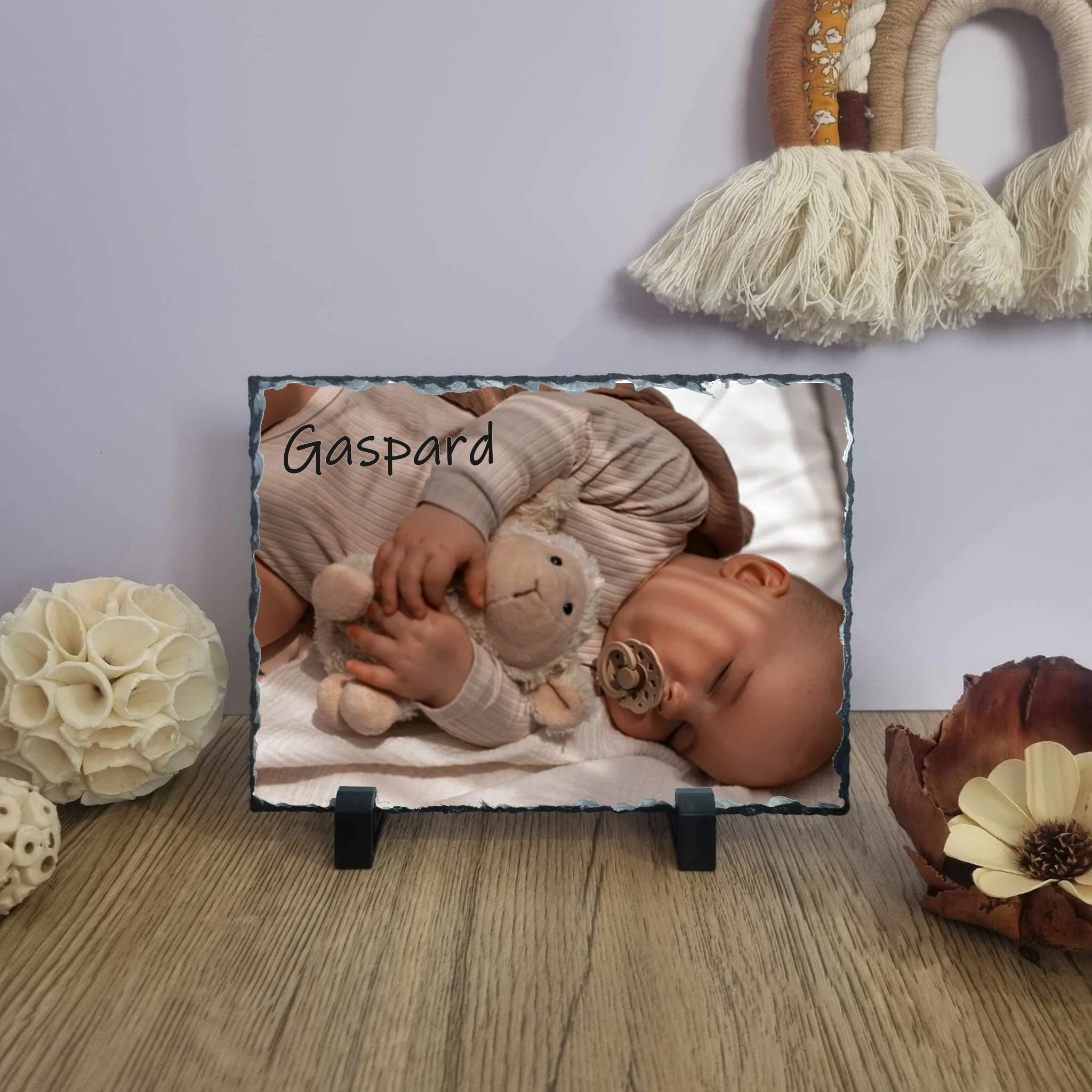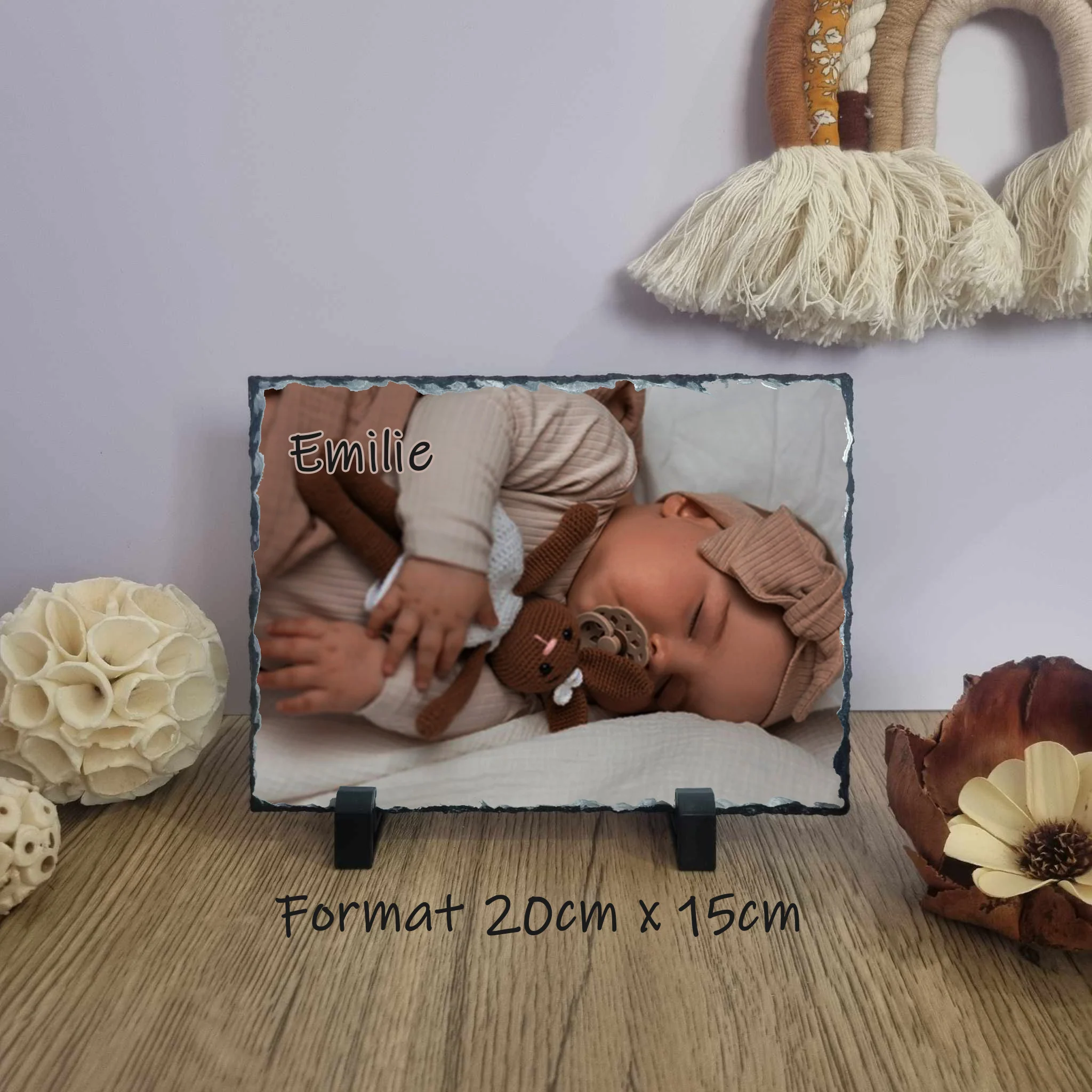 Immortalisez les premiers moments de vie de votre bébé avec notre magnifique ardoise personnalisée. Ce souvenir intemporel est parfait pour capturer et afficher la plus belle photo de votre nouveau-né. Chaque ardoise est soigneusement imprimée avec votre image préférée, créant une décoration unique et émotive pour votre maison ou un cadeau mémorable pour vos proches.