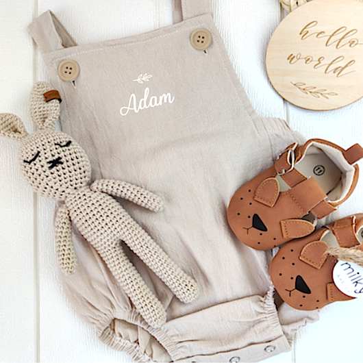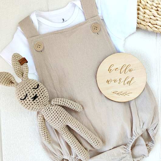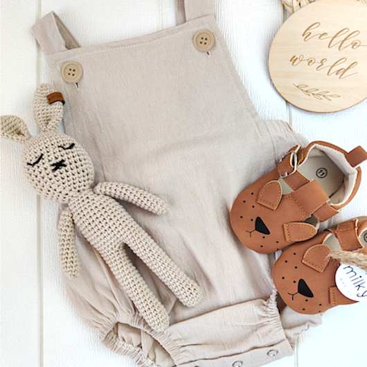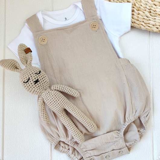 Jolie barboteuse bébé en tissu léger, sans manches, avec bretelles (croisées dans le dos) boutonnées sur le devant (vendu sans le body).