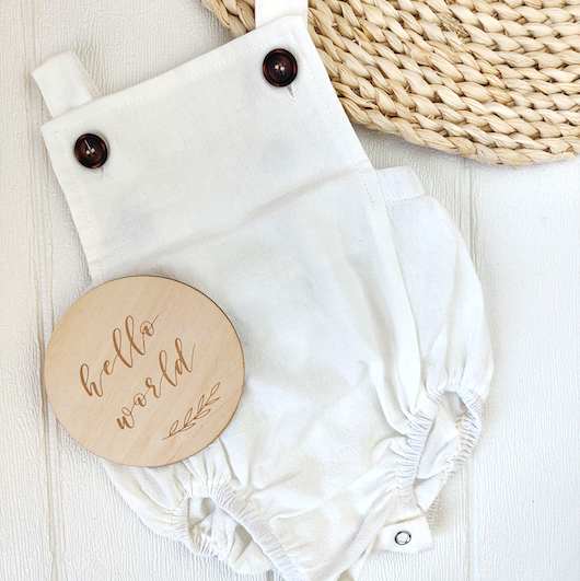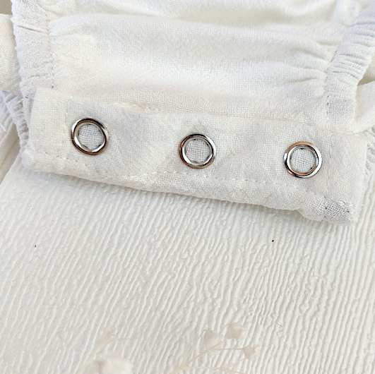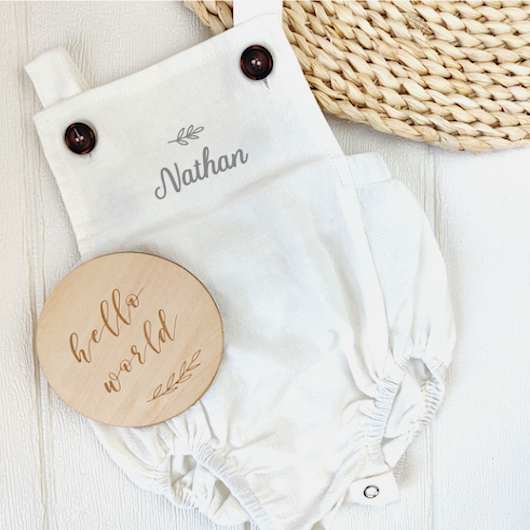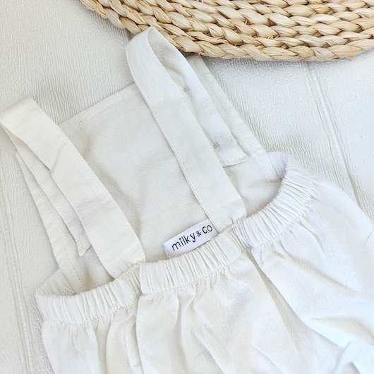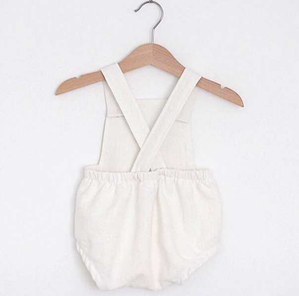 Jolie barboteuse bébé en tissu léger, sans manches, avec bretelles (croisées dans le dos ou en bretelles droites) boutonnées sur le devant.