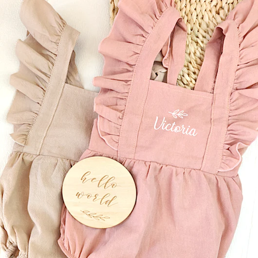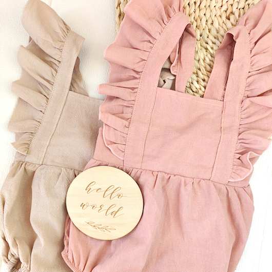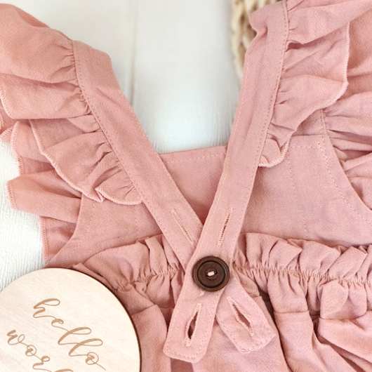 Jolie barboteuse bébé en tissu léger, sans manches, avec bretelles froncées réglables (croisées dans le dos) boutonnées sur l’arrière.