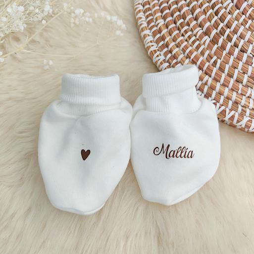 La petite paire de chaussons avec le prénom ou mots de votre choix, idéal pour composer un coffret naissance.