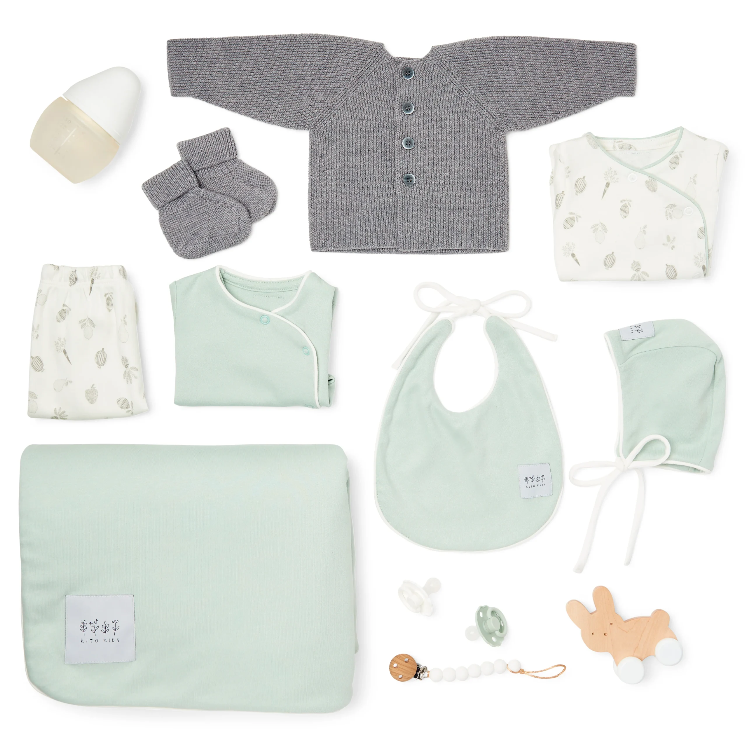 Chaque coffret rassemble tout le nécessaire pour habiller et accompagner bébé dès ses premiers jours. De la jaquette et des chaussons en laine mérinos aux pyjamas 1 et 2 pièces, en passant par la couverture matelassée, le bonnet et la bavette, chaque élément est pensé pour le confort, la praticité et l’esthétique. Les accessoires premium comme le biberon Elhée, les tétines FRIGG et l’attache-tétine Mushie apportent sécurité et praticité, tandis que le lapin en bois à pousser invite au jeu et à l’éveil.