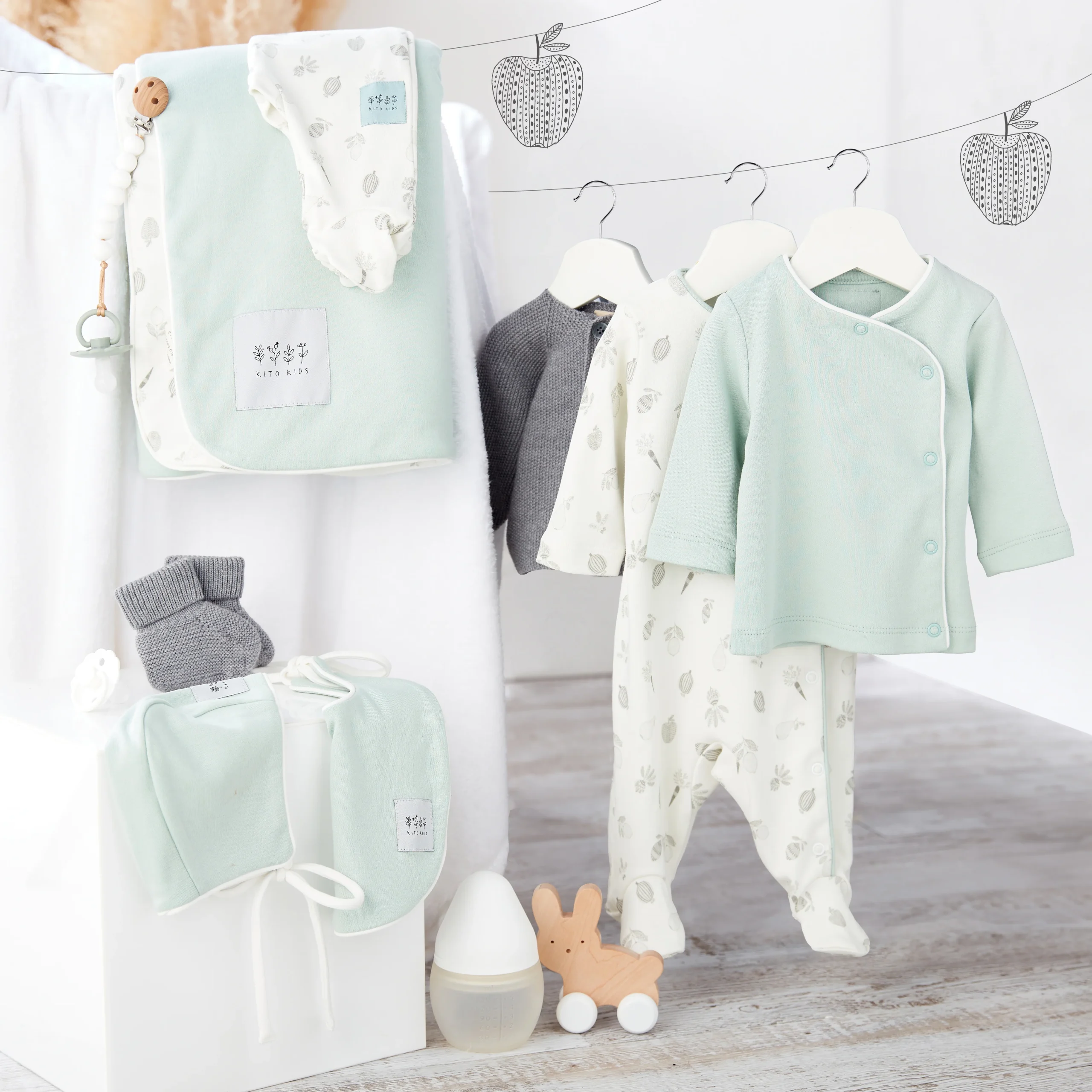 Textiles premium : pyjamas, bonnet, bavette et couverture matelassée doux et agréables au toucher.