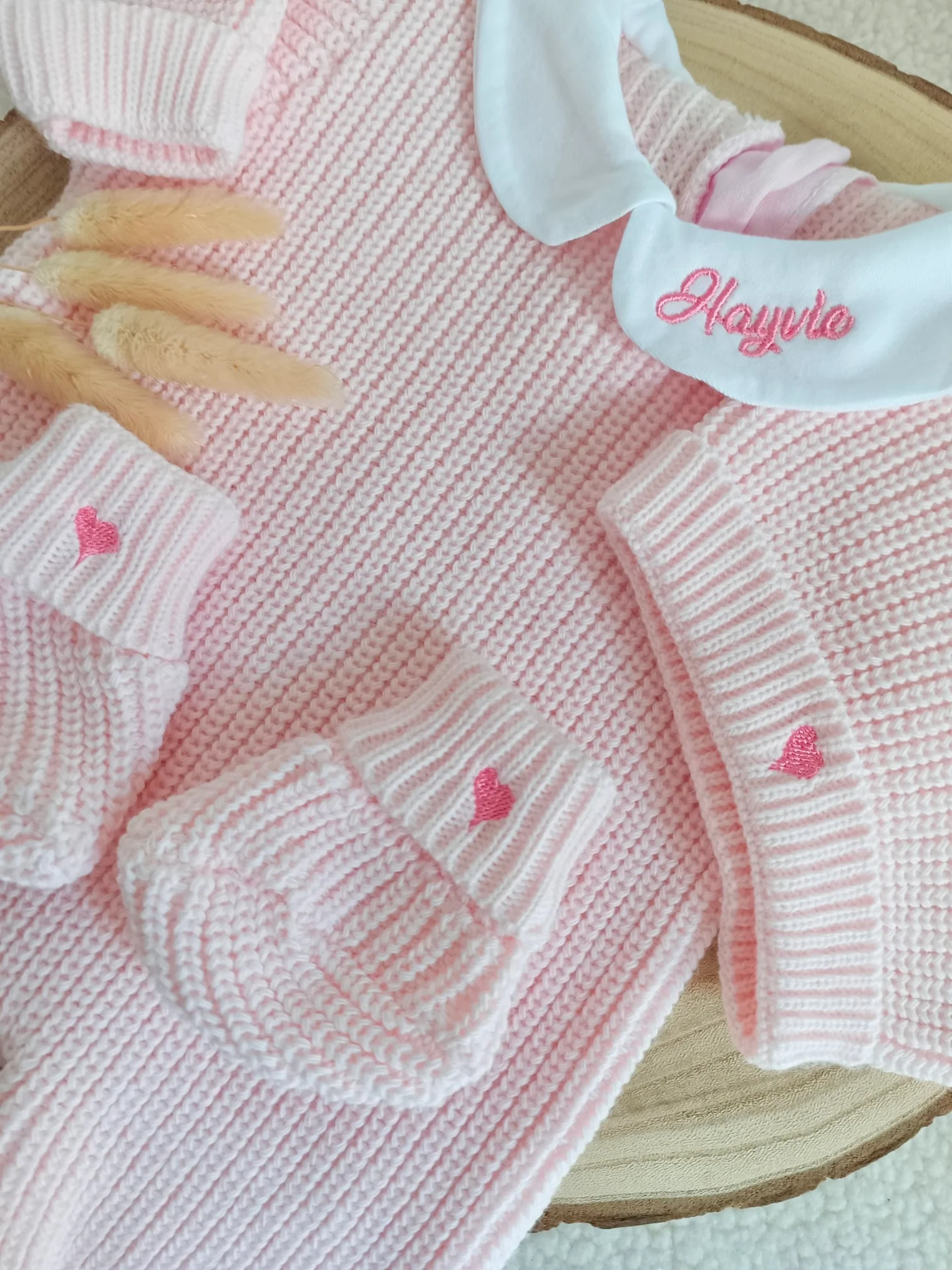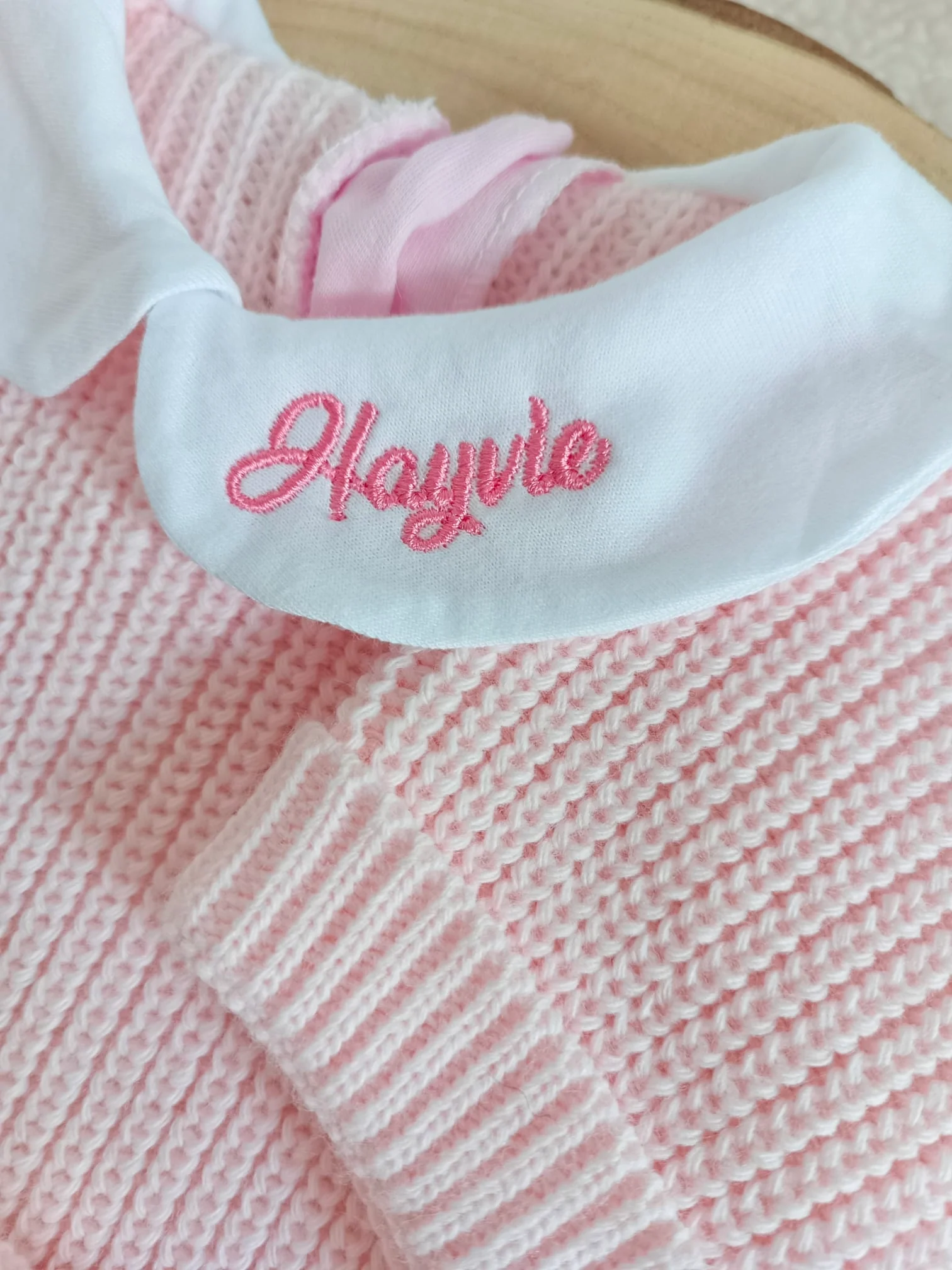 Combinaison maille rose avec col blanc – 0/3 mois – personnalisable