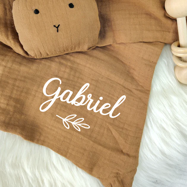 2/ Prénom brodé : le prénom est cousu avec une brodeuse sur le doudou (lavage en machine 40° maximum)