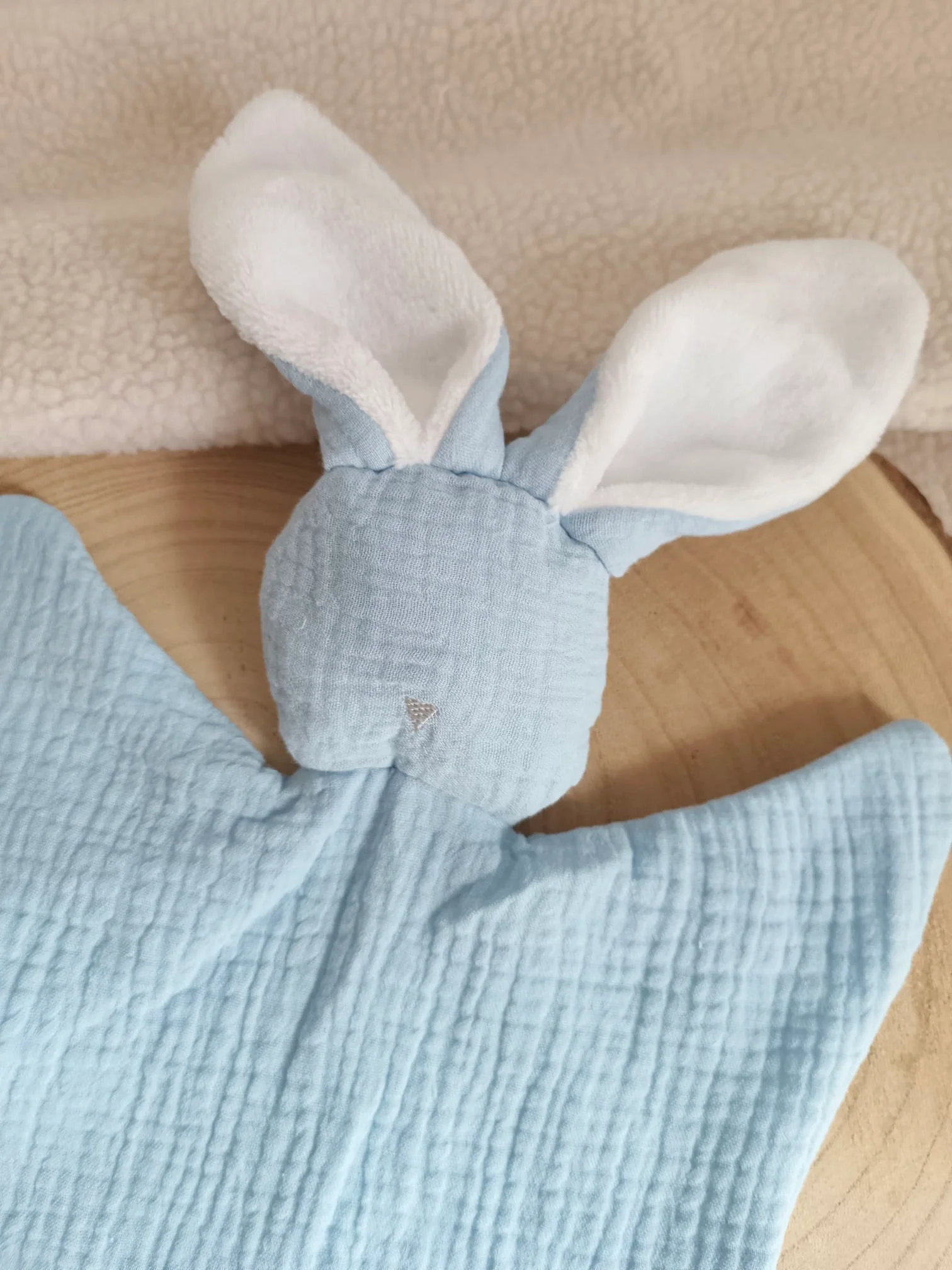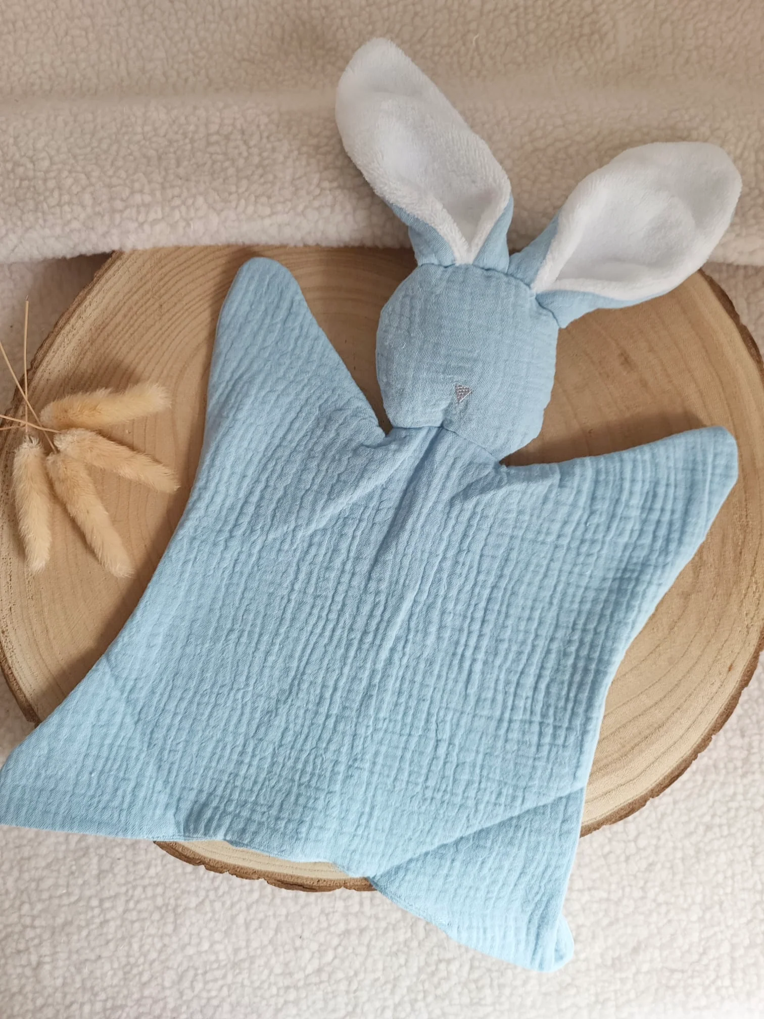 Doudou lapin avec oreilles blanche en gaze de coton bleu ciel
