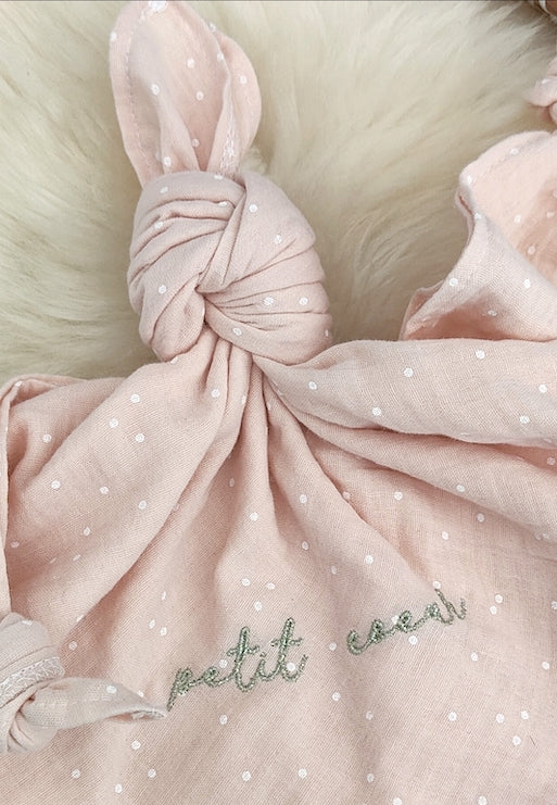 Trop mignon ce petit doudou lapin entièrement confectionné dans notre atelier, il pourra accompagner votre petit bout dès sa naissance.