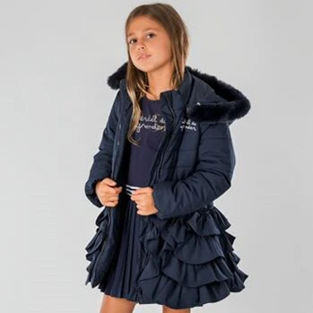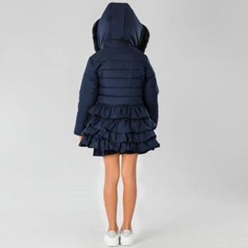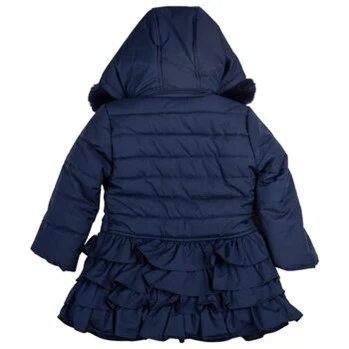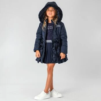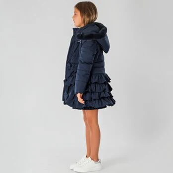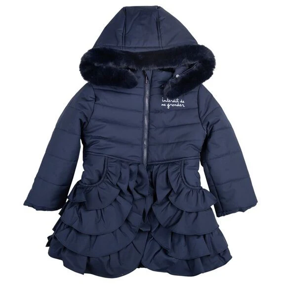Doudoune longue à capuche, Manches longues, Col montant, Fermeture zippée, Volants, Fourrure synthétique, Logo brodé