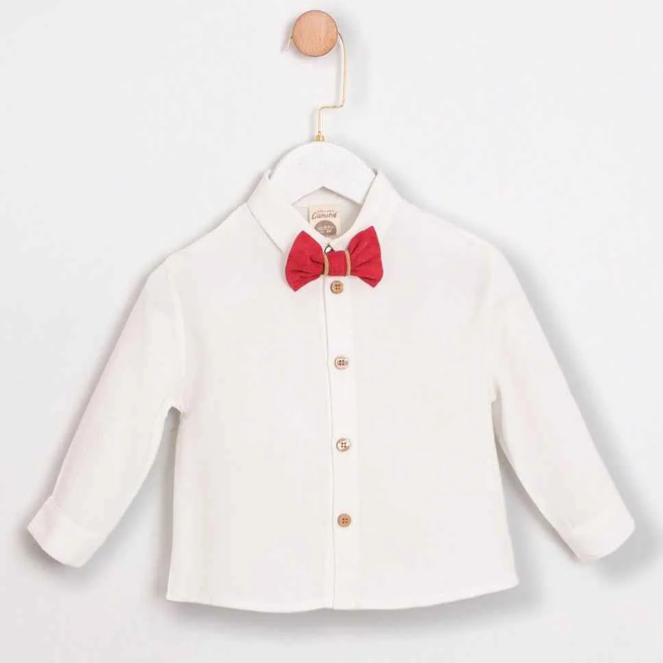 Ensemble 3 pièces pour bébé garçon comprenant une salopette rouge en velours côtelé, une chemise blanche à manches longues et un nœud papillon assorti. Détails en boutons bois et petit motif brodé pour une touche élégante. Tenue confortable et chic, parfaite pour les fêtes et les occasions spéciales.