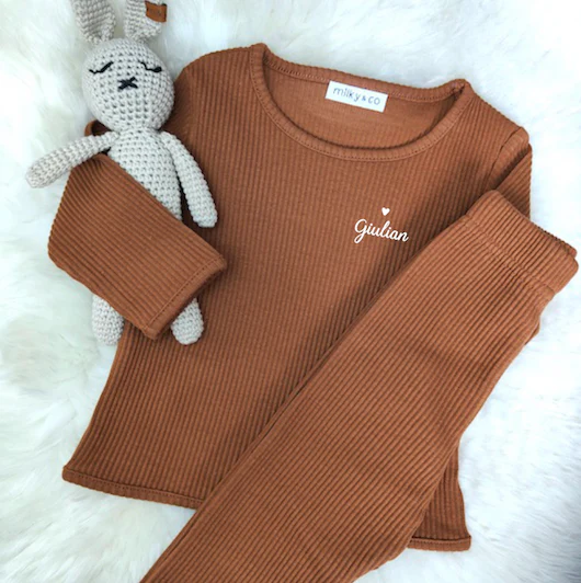 Ensemble très confortable côtelé en coton couleur caramel. Pantalon taille élastique.