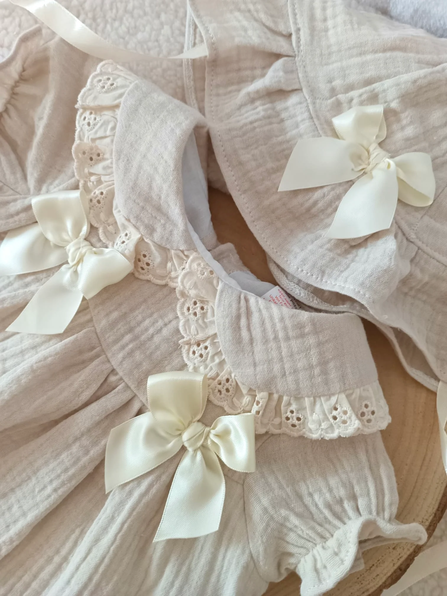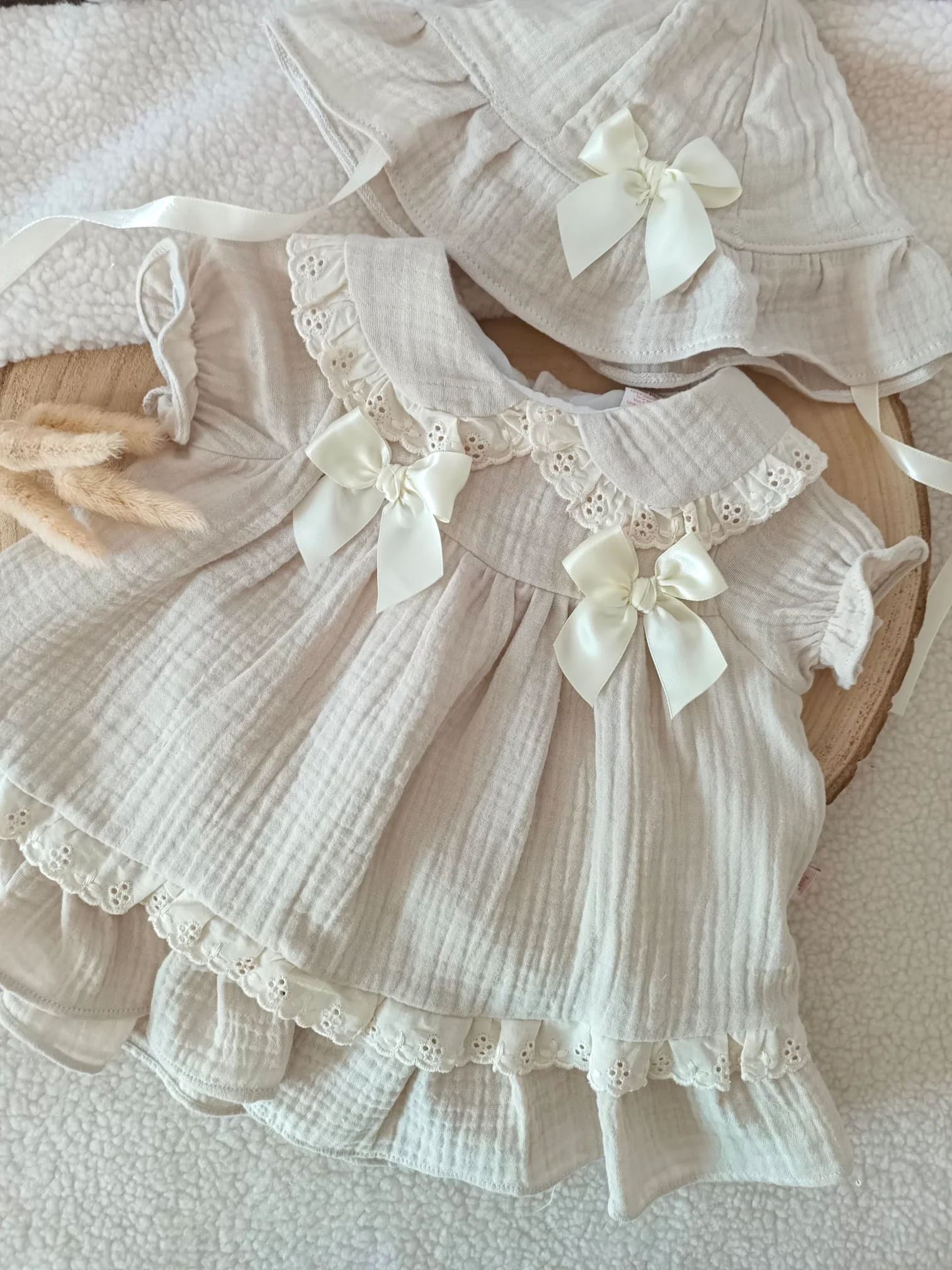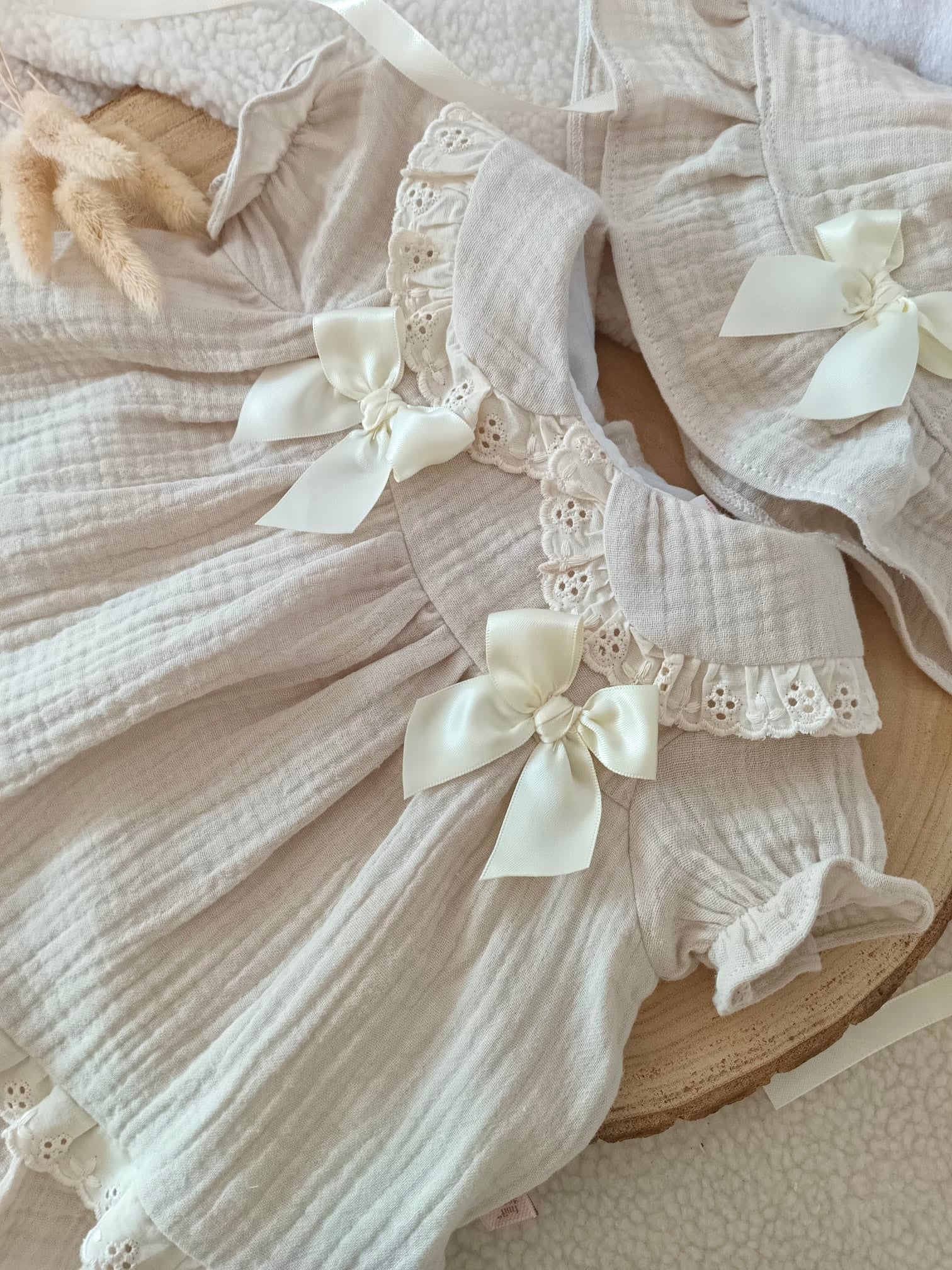 Offrez à votre petite fille un look adorable avec notre charmante robe en 100% coton, réalisée dans une douce matière en gaze de coton. Conçue spécialement pour les bébés, cette robe se distingue par ses délicats détails en dentelle et ses jolis nœuds, ajoutant une touche de raffinement à chaque moment.