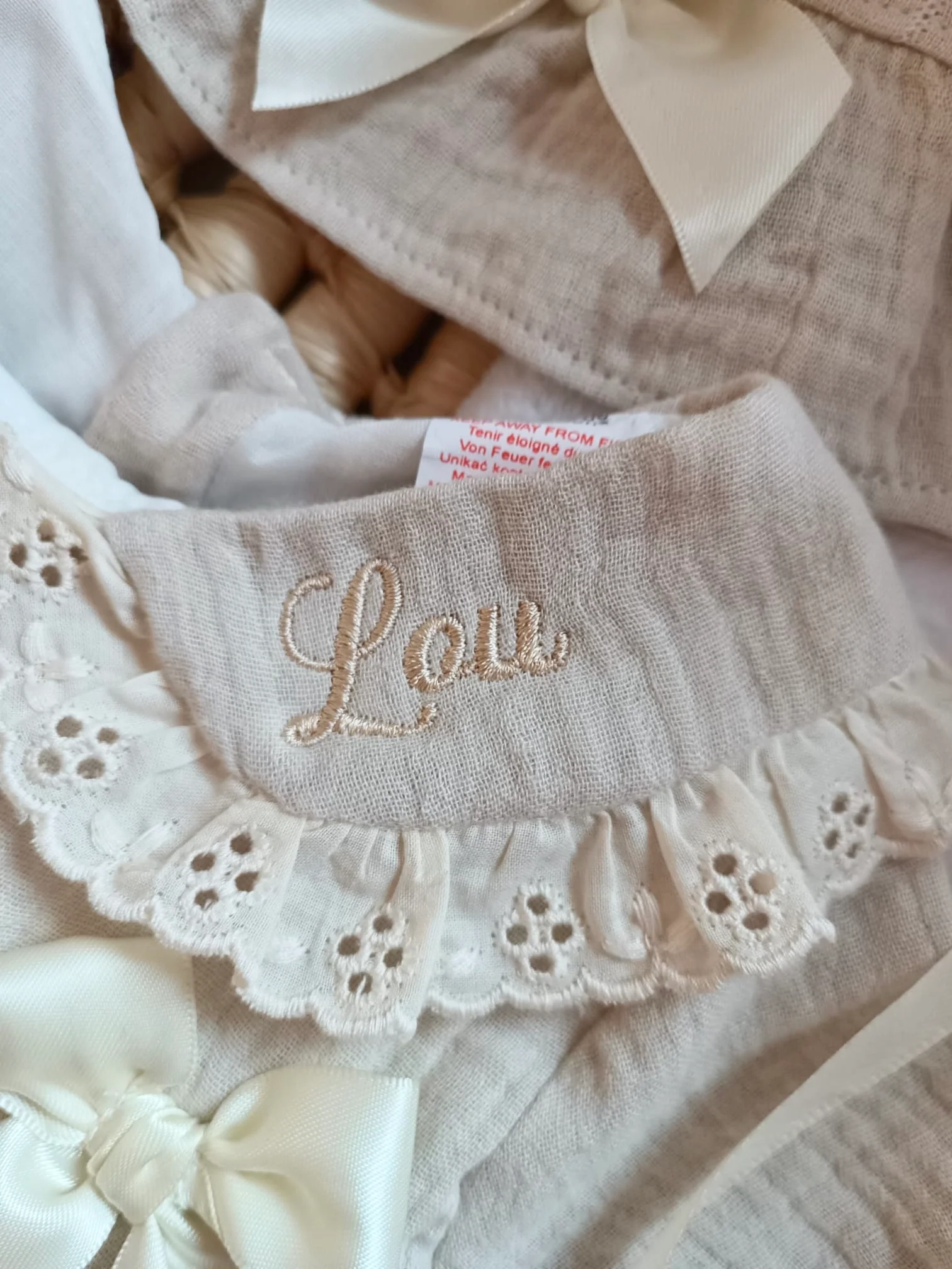 Disponible en plusieurs tailles, elle s’adapte parfaitement à la croissance de votre enfant. Pour une touche unique, nous proposons la personnalisation de la broderie du prénom sur le col côté cœur, rendant cette robe encore plus spéciale et mémorable.