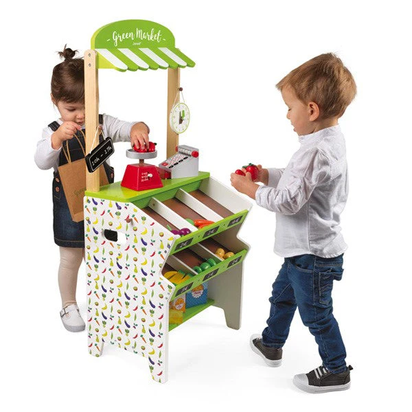 Ce jouet est équipé d’une horloge, d’un panneau ardoise, d’une boite de craies, de six boites d’aliments en carton, d’une caisse enregistreuse, d’une balance, de trois pommes, de trois bananes, de trois fraises, de trois carottes, de trois radis, de trois pommes de terre, d’un set de monnaie en papier et carton et de trois sacs de courses en papier.
