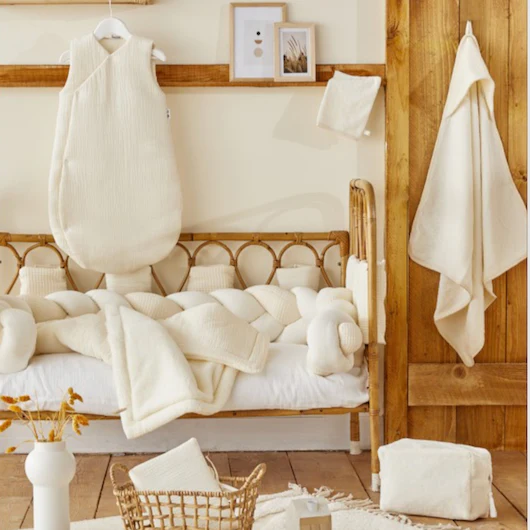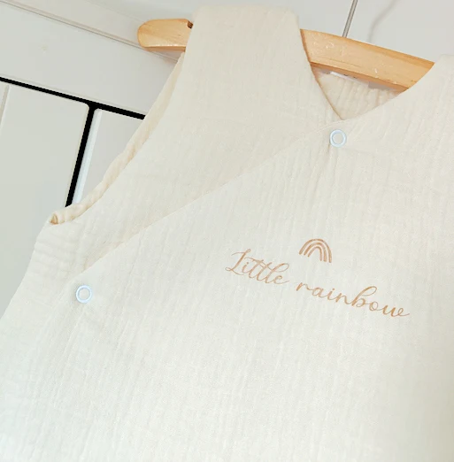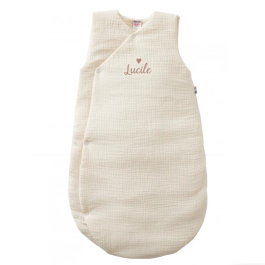 Une gigoteuse chic molletonnée en gaze de coton, entièrement doublée.