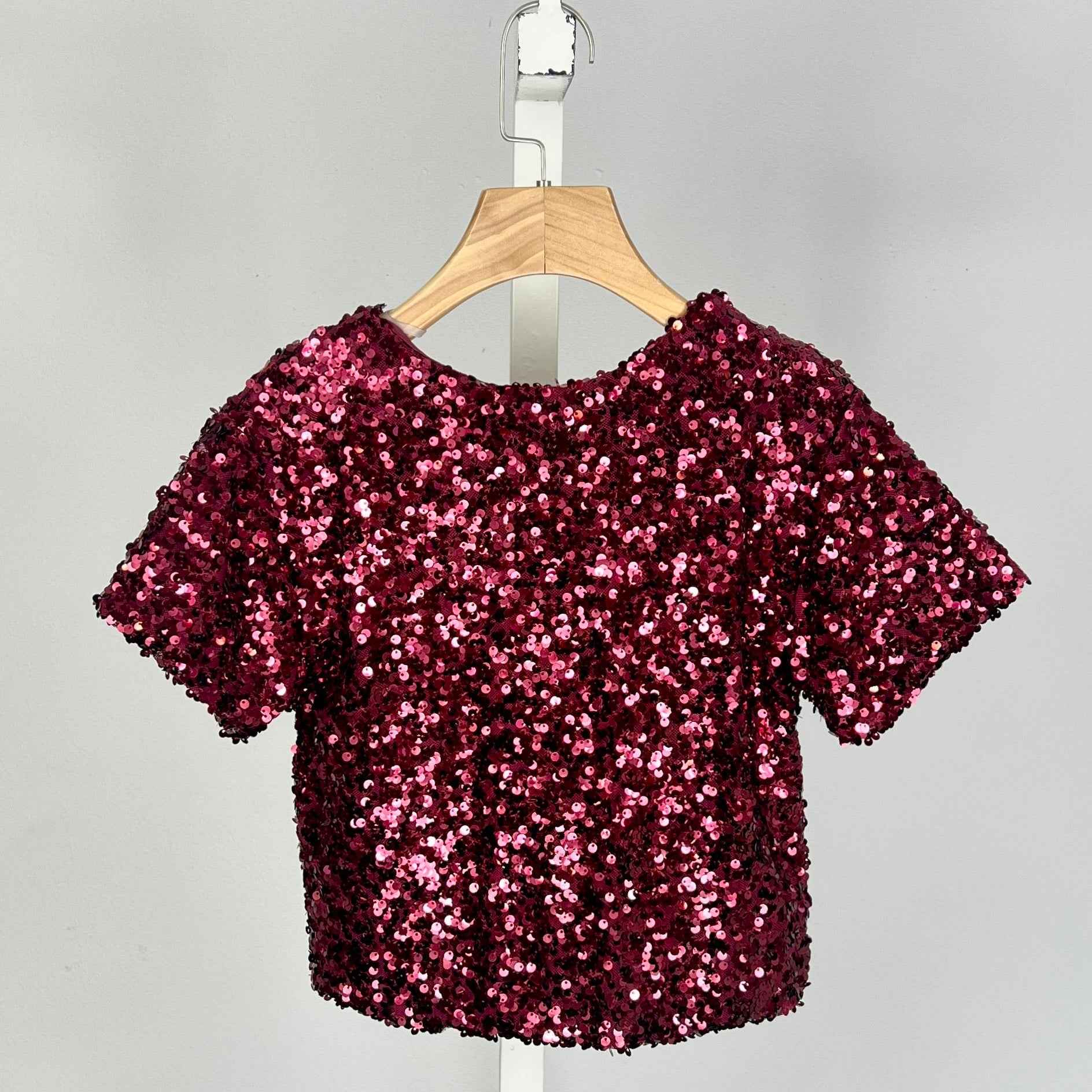 Haut fille à sequins au style festif, disponible en coloris rose scintillant ou doré. Entièrement recouvert de paillettes pour un effet brillant, avec coupe droite, manches courtes et encolure ronde. Parfait pour les fêtes, anniversaires ou occasions spéciales.