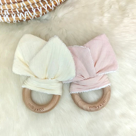 Facile à tenir grâce à sa forme ronde, bébé appréciera ce petit hochet avec ses oreilles en tissu et son anneau en bois de hêtre naturel non traité à mordiller !