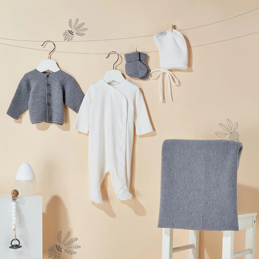 Pensée dans un esprit slow fashion, cette pièce est fabriquée en petites séries avec une grande attention portée à la qualité, à la durabilité et à la finesse du tricot. Le coloris gris, doux et intemporel, s’intègre facilement dans toutes les garde-robes. Disponible en plusieurs tailles allant de la naissance jusqu’à environ 18 mois, cette jaquette accompagne bébé pendant ses premiers mois de découvertes avec confort et élégance.