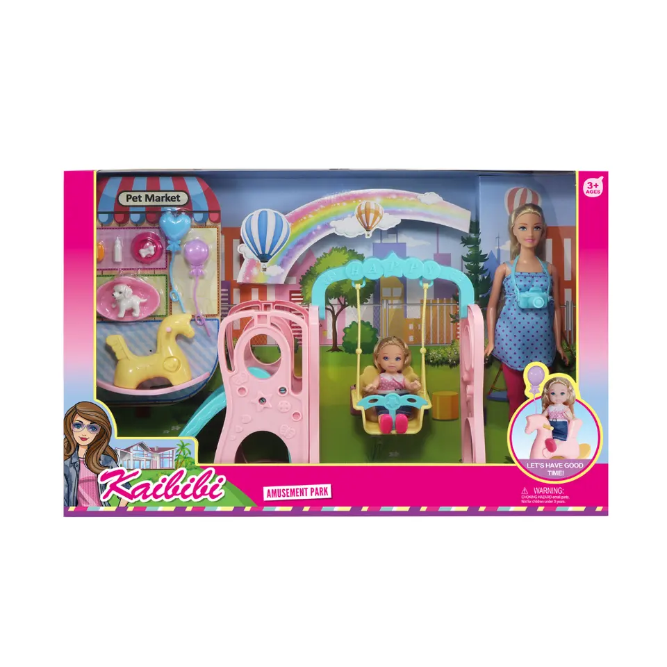 Une belle poupée avec des cheveux et un sourire sur son visage, accompagnée de sa petite avec une magnifique balançoire avec des matériaux sûrs et durables.