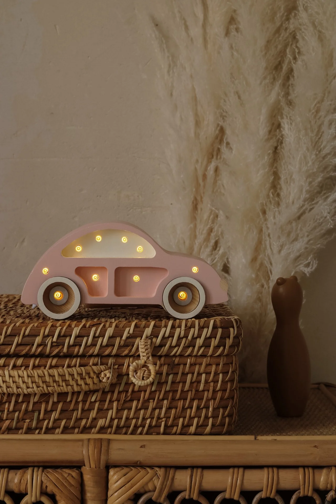 Compacte et pleine de caractère, cette veilleuse miniature en forme de voiture Coccinelle diffuse une lumière douce idéale pour accompagner les nuits des plus jeunes. Sculptée dans du bois de pin massif, elle allie esthétique rétro et sécurité moderne.