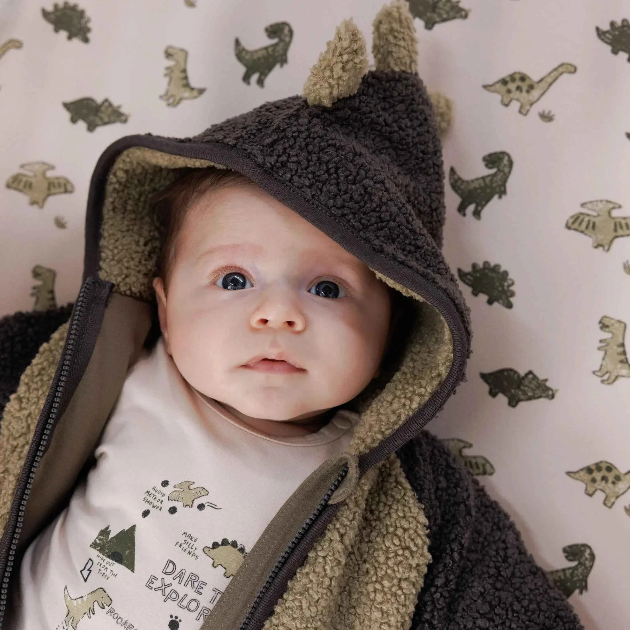 Ce manteau tout doux est un véritable cocon de chaleur pour bébé ! Fabriqué dans une matière effet mouton, il allie confort et originalité avec sa capuche ornée de petites crêtes façon dinosaure. L’intérieur doublé d’un tissu contrastant kaki apporte une touche de style supplémentaire. Pratique grâce à sa fermeture zippée, il garde bébé bien au chaud tout en facilitant l’habillage. Un manteau adorable et ludique, parfait pour affronter les journées fraîches avec style et douceur.
