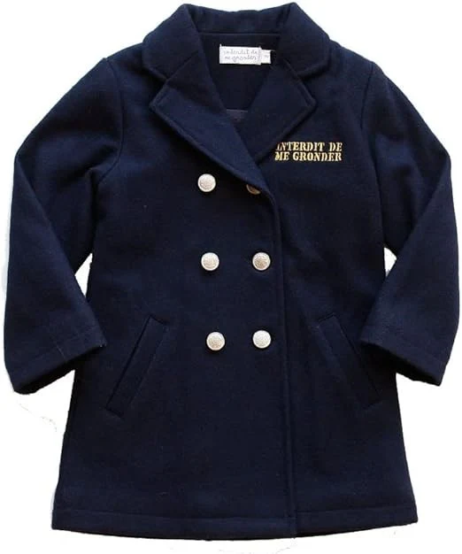 Découvrez le manteau « Ancre » de la marque Interdit de me gronder. Ce manteau élégant en bleu marine foncé présente une coupe classique avec un double boutonnage de boutons dorés brillants, ajoutant une touche chic et intemporelle. Le col est orné d’une bande de tissu blanc avec le logo de la marque brodé, et un discret message en fil blanc est également présent sur le devant. Parfait pour compléter une tenue avec style et chaleur.