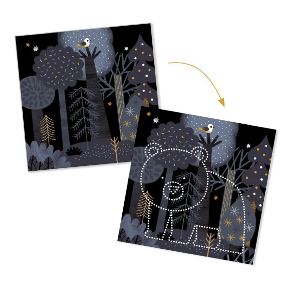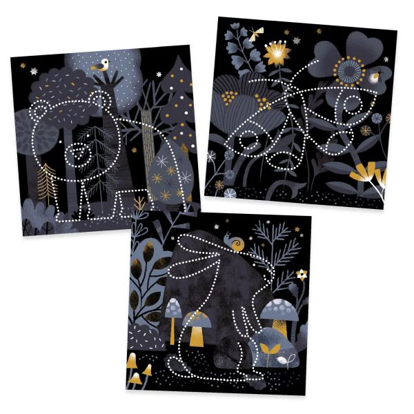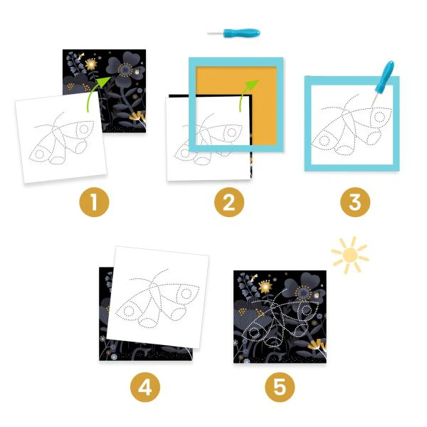 L’enfant choisit un fond et l’animal qui va apparaître. Il bloque ensuite les 2 feuilles dans le support. À l’aide de l’outil, il picote en suivant les points des trames. L’enfant place une source lumineuse derrière son fond : surprise, l’animal apparait!