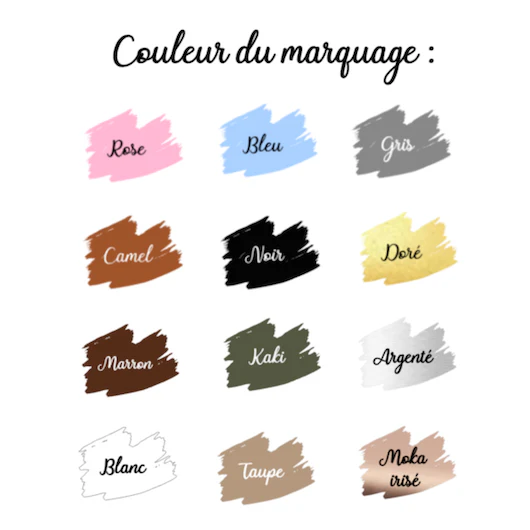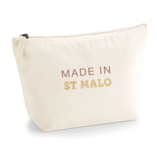 Exemple : « made in » en taupe, « st malo » en doré