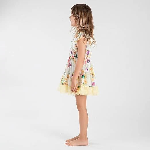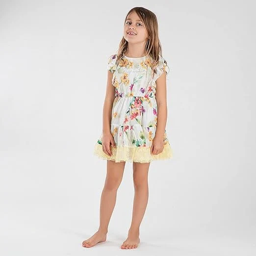 Robe à volants, Manches courtes, Col rond, Base évasée, Doublure en coton, Imprimé floral en all over, Dentelle décorative à la base