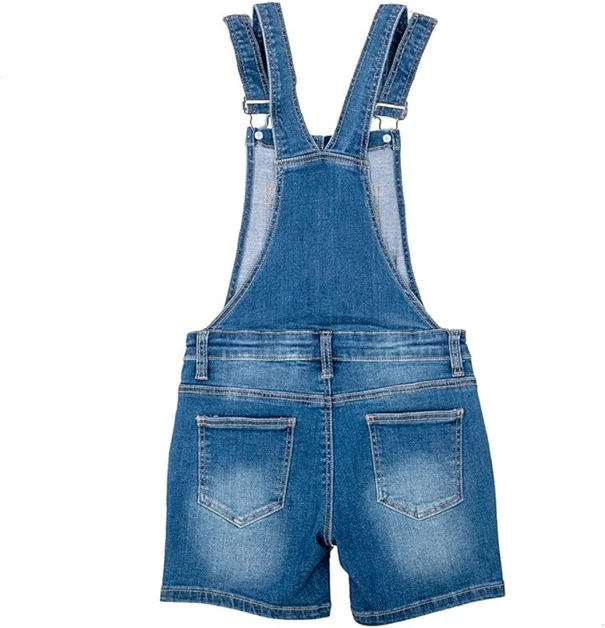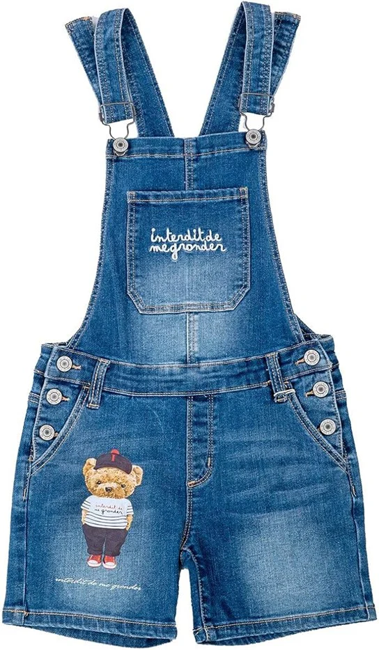 Salopette en denim courte, bretelles réglables, plusieurs poches, bretelles à clip sur la poitrine, boutons à la taille, braguette avec passants de ceinture, motif d’ours, logo brodé.