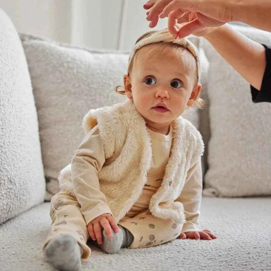Ce gilet sans manches pour bébé est à la fois chaud et adorable. Confectionné dans une matière effet fourrure ultra douce, il offre un confort enveloppant idéal pour la mi-saison ou pour réchauffer une tenue en hiver. Sa douce couleur écru s’accorde facilement avec toutes les tenues, qu’elles soient décontractées ou plus habillées. Ce modèle se ferme à l’avant grâce à deux boutons en bois, ajoutant une touche naturelle et authentique au style. Léger et pratique, il s’enfile facilement par-dessus un pull, une blouse ou un body pour un look cosy et tendance. Un indispensable plein de charme pour compléter la garde-robe de votre enfant.