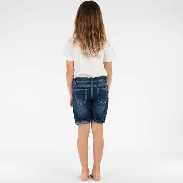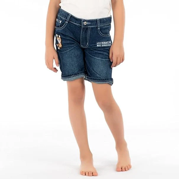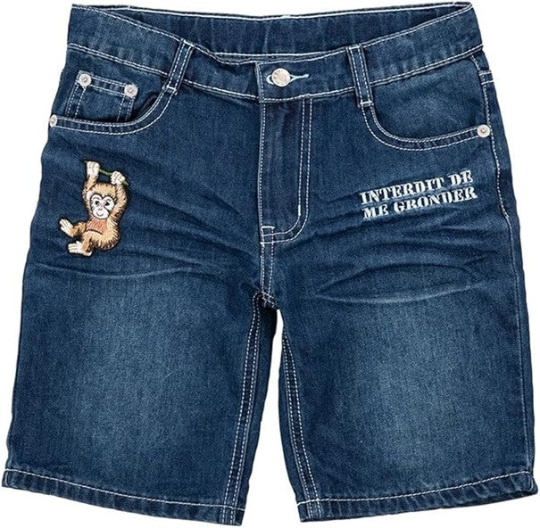 Coupe droite au niveau des cuisses, plusieurs poches, taille ajustable par élastique intérieur avec bouton, bouton à la taille, zip à l’entrejambe, ceinture sous passants, appliqué de singe brodé.