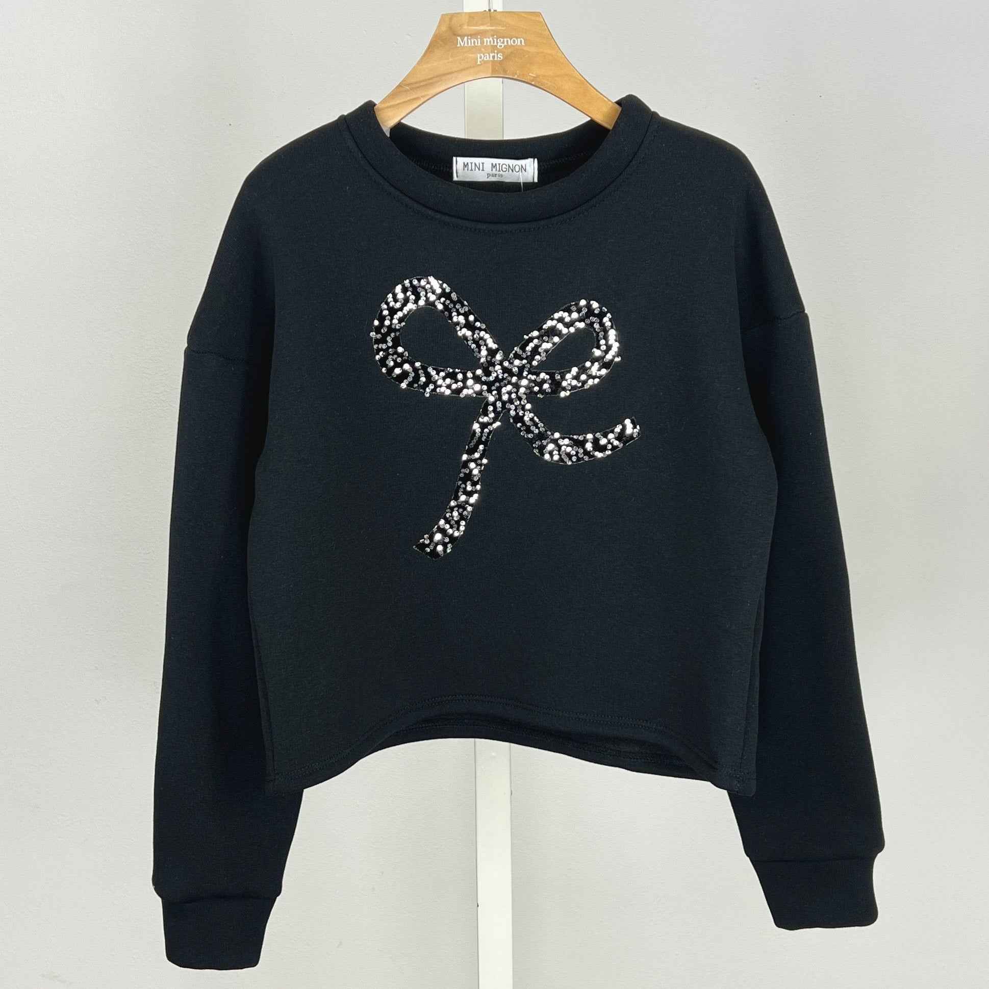 Sweat fille noir doux et confortable, décoré d’un grand nœud en sequins pour une touche brillante et élégante. Coupe légèrement courte, manches longues et encolure ronde. Idéal pour un look chic et tendance au quotidien ou pour les occasions.
