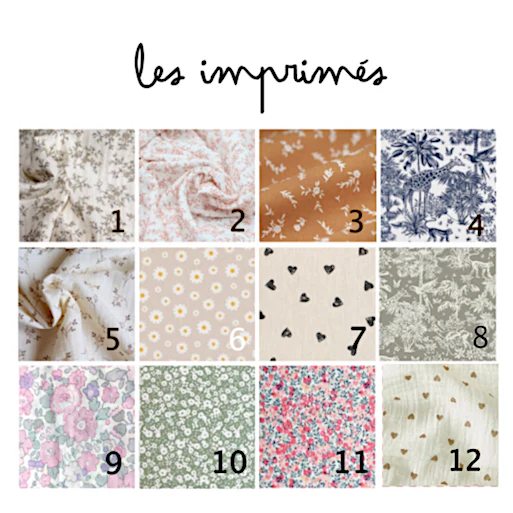 18 tissus (gaze de coton ou coton, tissu uni ou à motifs).