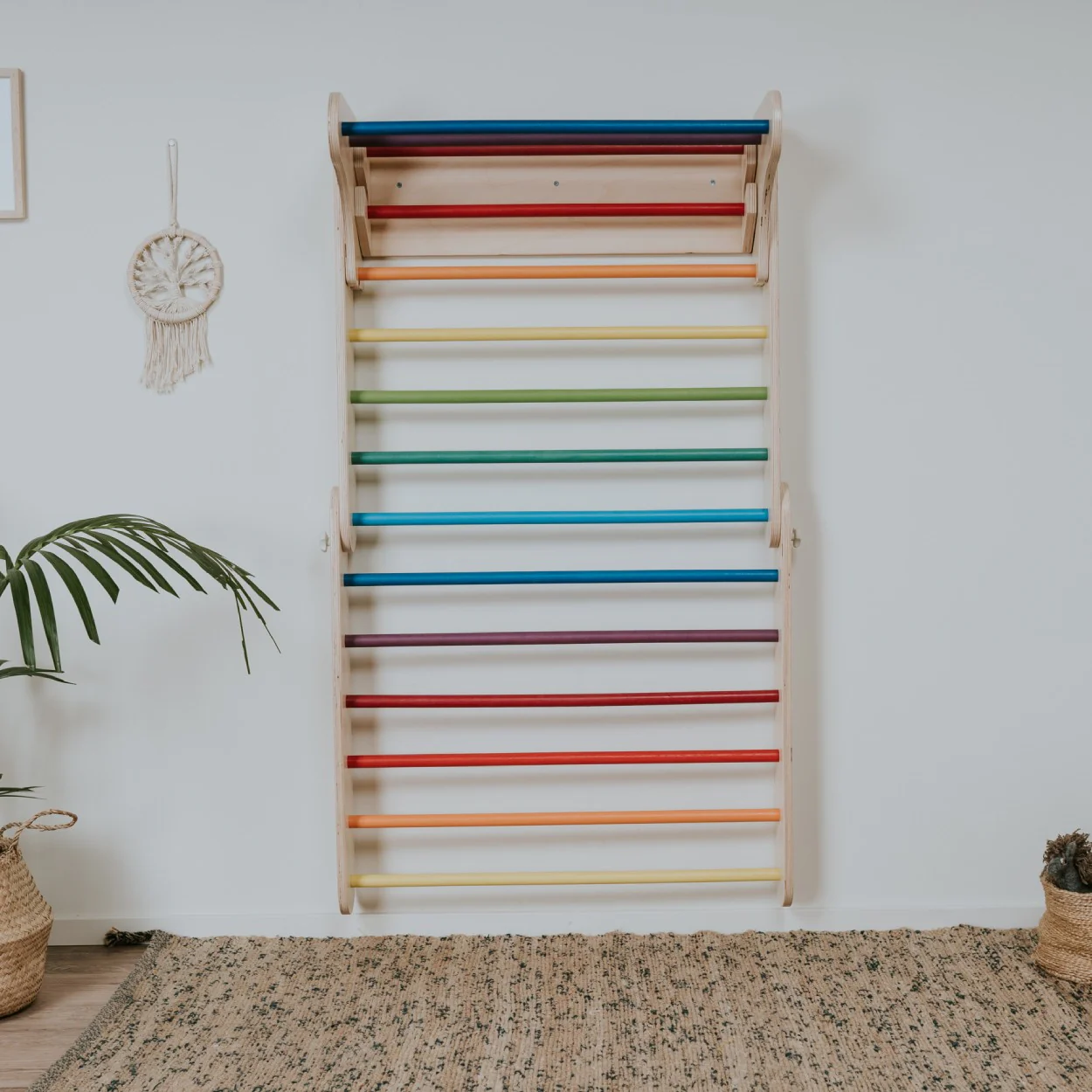 Triangle d’escalade Pikler avec mur suédois – Arc-en-ciel