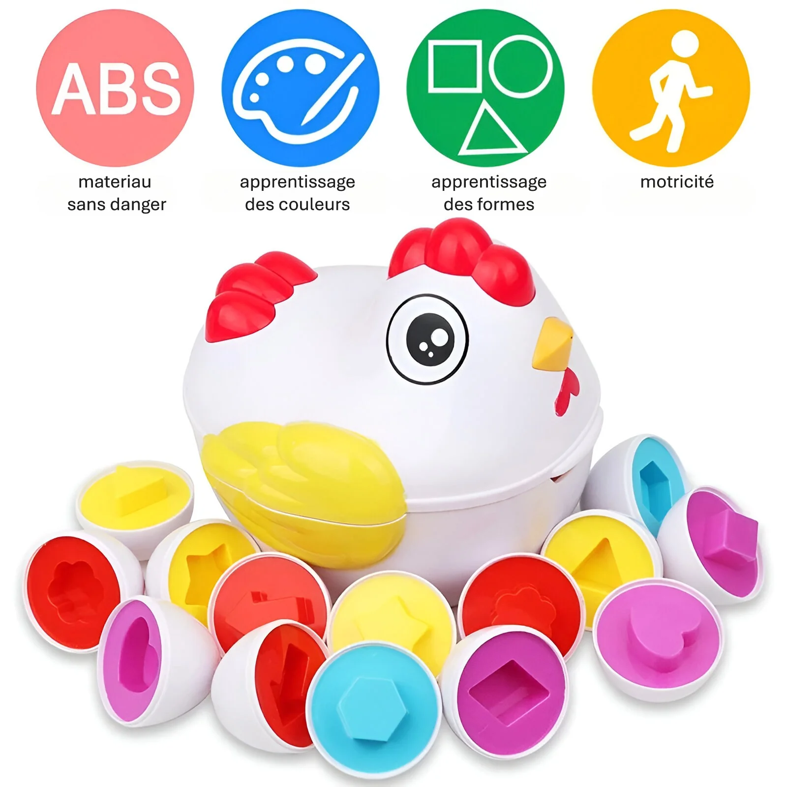 En ouvrant chaque œuf, il découvre des formes et couleurs assorties, l’aidant à développer sa motricité fine, sa coordination main-œil et à apprendre les bases de la géométrie de façon ludique. 🟠🔺🟢