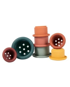 7 pots empilables en silicone de différentes couleurs que l’enfant va empiler en une tour ou les mettre les uns dans les autres. Ils sont troués pour que l’enfant puisse faire pleuvoir dans son bain.